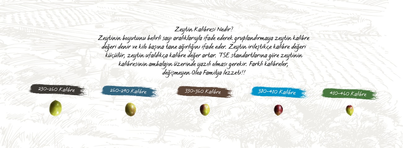 Yemyeşil manzaralardan sofralarınıza gelen lezzet taneleri farklı kalibre seçenekleri ve siyah, yeşil, biberli, çizik, kırma, soslu çeşitleriyle Olea Familya'da.